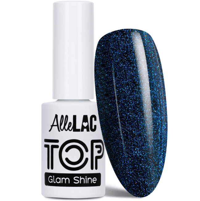 Na utwardzony kolorowy lakier hybrydowy nałóż cienką warstwę topu Glam Shine No Wipe Azurite. Utwardź w lampie UV/LED. Produkt nie wymaga przemywania cleanerem.