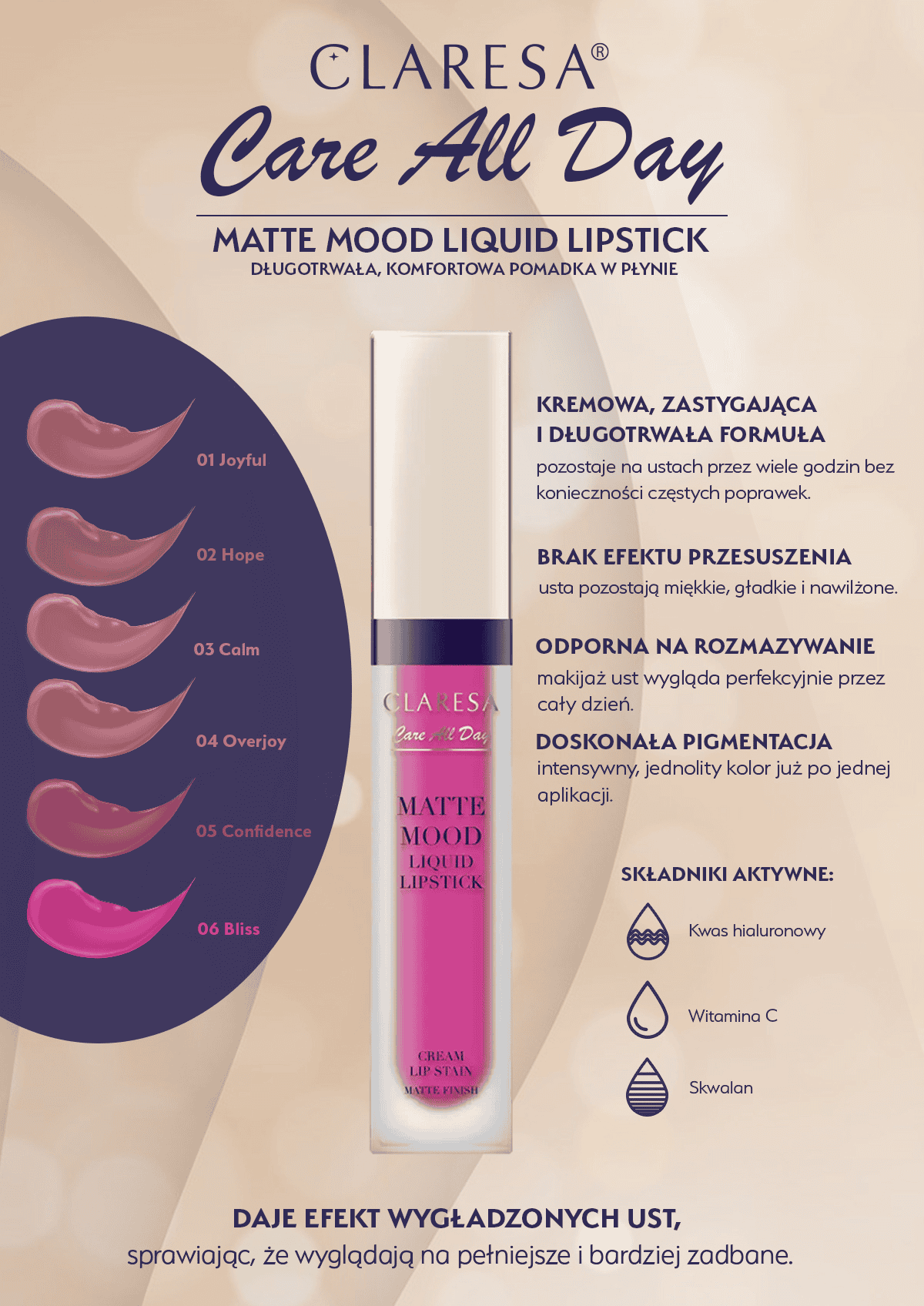 Claresa Pomadka w Płynie 04 Overjoy Matte Mood Długotrwały Komfort i Kolor